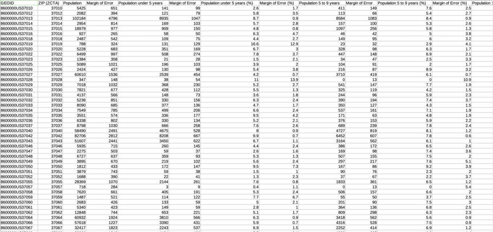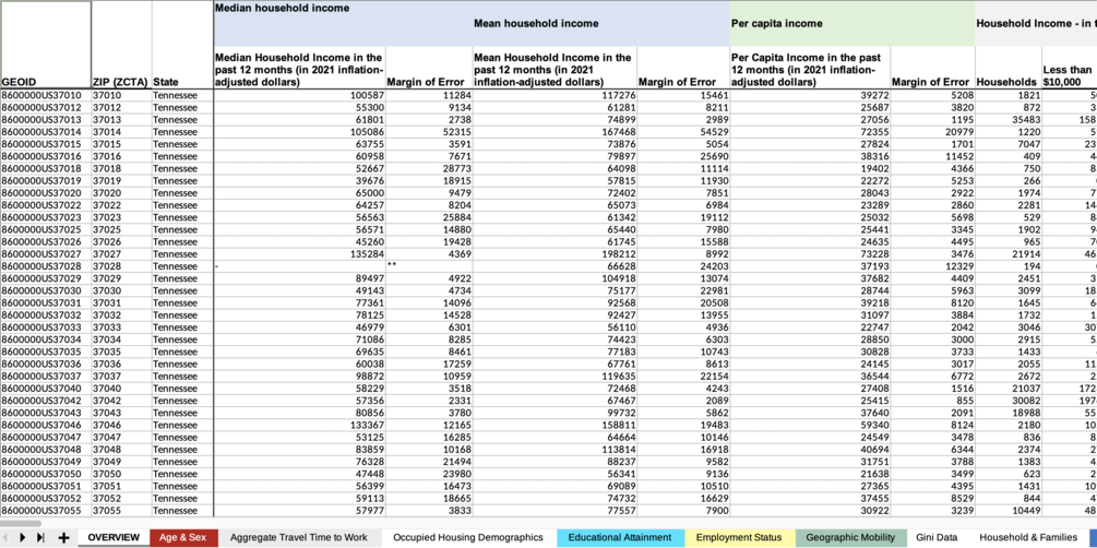 Censtats: Tennessee (2021) offers a curated and pre-formatted collection of data sourced from the United States Census and the American Community Survey's 5-year estimates for 2021. This data comes in the form of a comprehensive XLSX file as well as individual CSV and JSON files.