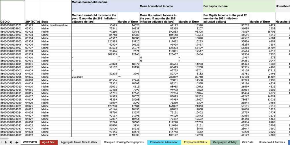 Censtats: Maine (2021) offers a curated and pre-formatted collection of data sourced from the United States Census and the American Community Survey's 5-year estimates for 2021. This data comes in the form of a comprehensive XLSX file as well as individual CSV and JSON files.