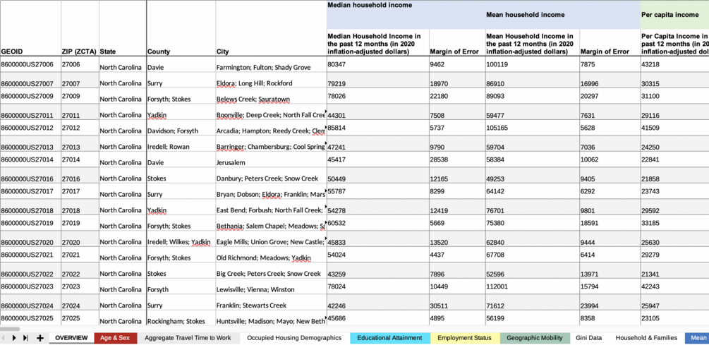 Censtats: North Carolina (2020) offers a curated and pre-formatted collection of data sourced from the United States Census and the American Community Survey's 5-year estimates for 2020. This data comes in the form of a comprehensive XLSX file as well as individual CSV and JSON files.