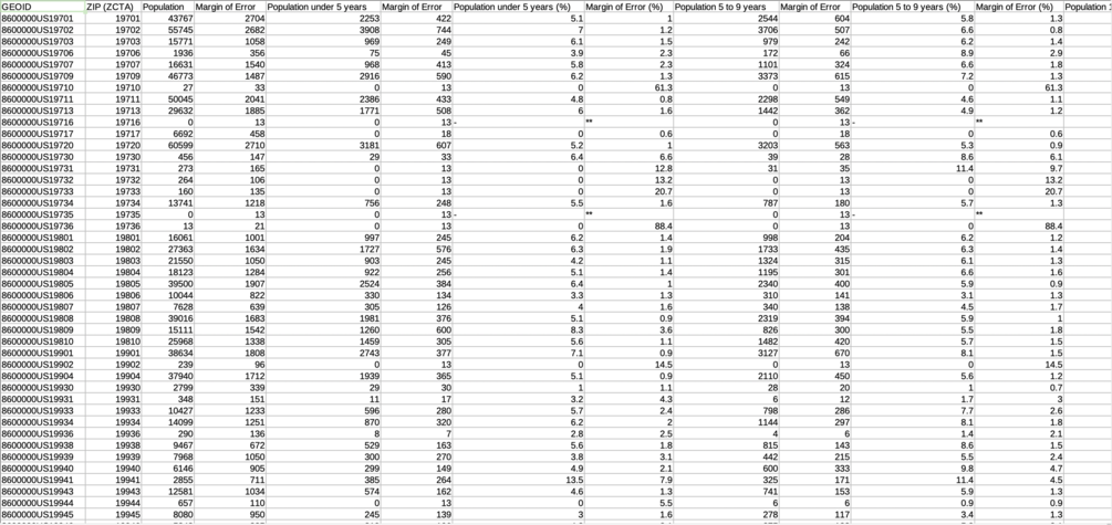 Censtats: Delaware (2021) offers a curated and pre-formatted collection of data sourced from the United States Census and the American Community Survey's 5-year estimates for 2021. This data comes in the form of a comprehensive XLSX file as well as individual CSV and JSON files.
