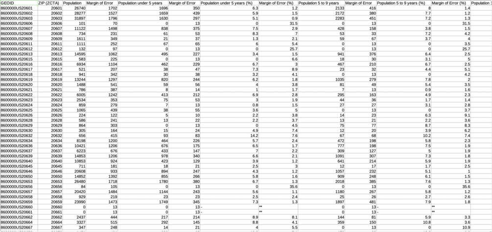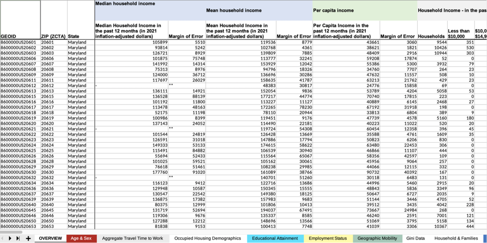 Censtats: Maryland (2021) offers a curated and pre-formatted collection of data sourced from the United States Census and the American Community Survey's 5-year estimates for 2021. This data comes in the form of a comprehensive XLSX file as well as individual CSV and JSON files.