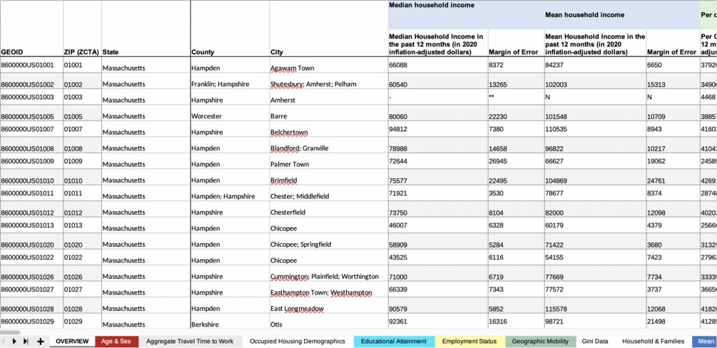 Censtats: Massachusetts (2020) offers a curated and pre-formatted collection of data sourced from the United States Census and the American Community Survey's 5-year estimates for 2020. This data comes in the form of a comprehensive XLSX file as well as individual CSV and JSON files.