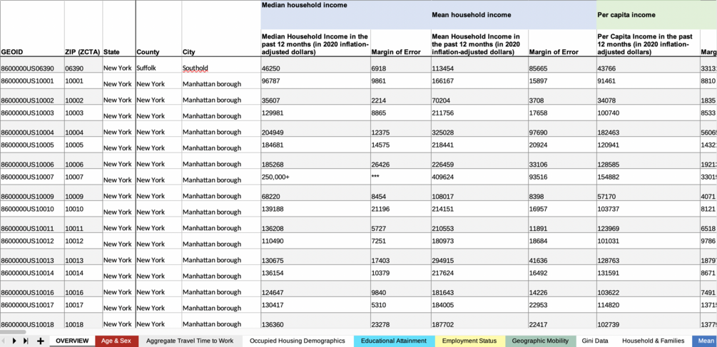 Censtats: New York (2020) offers a curated and pre-formatted collection of data sourced from the United States Census and the American Community Survey's 5-year estimates for 2020. This data comes in the form of a comprehensive XLSX file as well as individual CSV and JSON files.