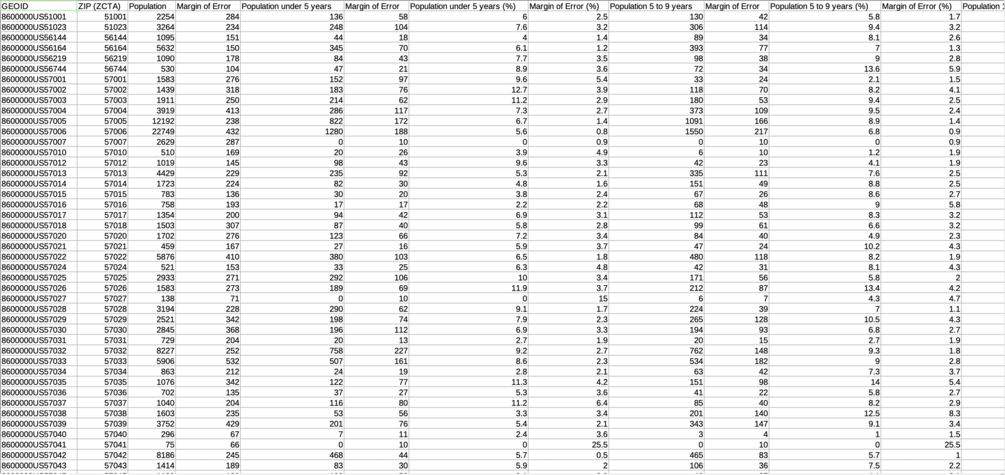 Censtats: South Dakota (2021) offers a curated and pre-formatted collection of data sourced from the United States Census and the American Community Survey's 5-year estimates for 2021. This data comes in the form of a comprehensive XLSX file as well as individual CSV and JSON files.