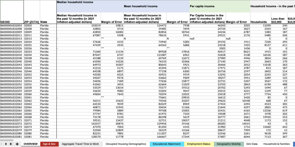 Censtats: Florida (2021) offers a curated and pre-formatted collection of data sourced from the United States Census and the American Community Survey's 5-year estimates for 2021. This data comes in the form of a comprehensive XLSX file as well as individual CSV and JSON files.
