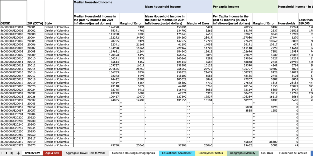 Censtats: District of Columbia (2021) offers a curated and pre-formatted collection of data sourced from the United States Census and the American Community Survey's 5-year estimates for 2021. This data comes in the form of a comprehensive XLSX file as well as individual CSV and JSON files.