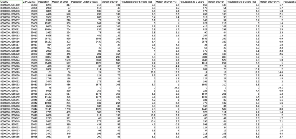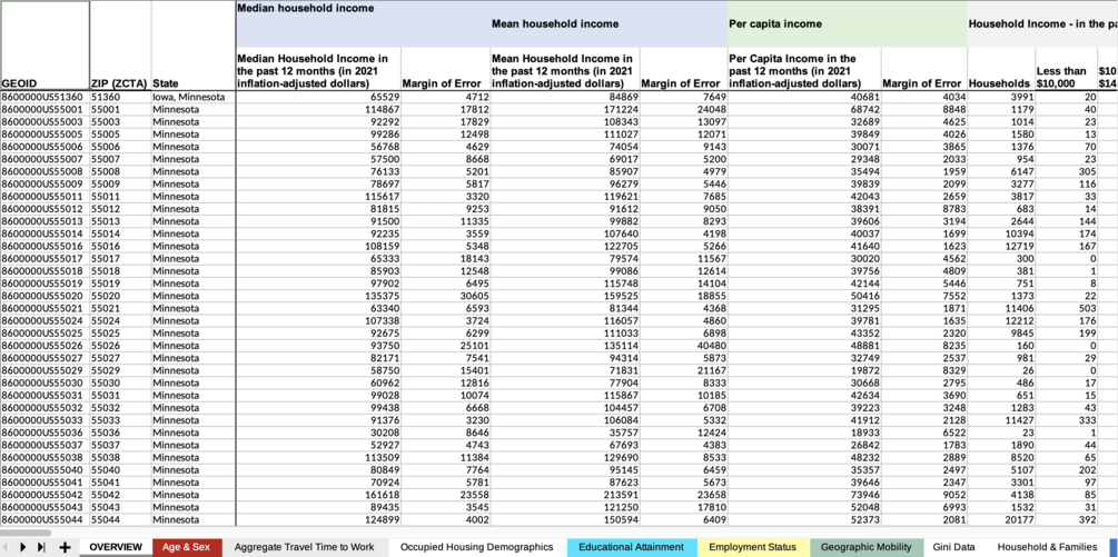 Censtats: Minnesota (2021) offers a curated and pre-formatted collection of data sourced from the United States Census and the American Community Survey's 5-year estimates for 2021. This data comes in the form of a comprehensive XLSX file as well as individual CSV and JSON files.